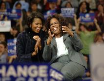 Oprah and her guest, Michelle Obama, discuss BA cheeseburgers they have eaten.